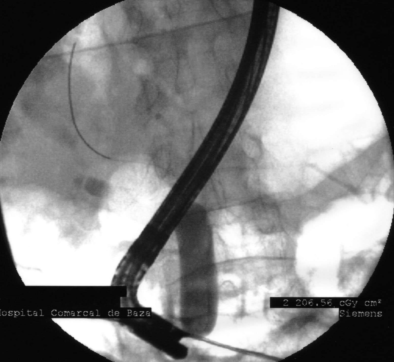 Tres son las técnicas que realizamos. El primer caso está documentado con imágenes de colangiografía y video. Se trata de una mujer de 80 años de edad, diabética, colecistectomizada hace nueve años e ingresada en junio por un episodio de colangitis aguda leve en el que los estudios radiológicos mostaban la presencia de colédocolitiasis y una VB dilatada. En espera de la realización de la CPRE en otro hospital, presentó un nuevo episodio. Esta fue la primera CPRE realizada en el Hospital Comarcal de Baza y, casualmente, es el ejemplo del porqué se planteó implantar la técnica: acortar los períodos de espera. En los otros dos casos no hay documentación completa pues usamos una columna de otro fabricante sin grabadora de video. El segundo caso es una paciente de 87 años de edad con FA, EM e HTpulmonar, anticoagulada, con diagnóstico previo de colédocolitiasis en otro Hospital, en donde se le realizó una esfinterotomía parcial y colocación de un stent plástico para intentar, en una segunda exploración, completar el procedimiento. Realmente el enfrentamiento de la papila era complicado y las litiasis de buen tamaño (13-15 mm) con una VB de 20-22 mm. Lo más interesante del caso, y eso sí lo podemos ver en las imágenes, es la esfinteroplastia con balón de gran tamaño (18 mm) que tuvimos que realizar para poder extraer los cálculos. En el tercer caso del día no obtuvimos el 100% de los objetivos, pero sí confirmamos la sospecha diagnóstica previa. Se trata de un varón diagnosticado en febrero de un tumor pancreático endocrino con metástasis en LHD y LHI, sometido en mayo a DPC + hepatectomía derecha, com varias complicaciones postquirúrgicas, destacando la aparición de una fuga biliar y desarrollo de un shock séptico. Desde el mes de agosto presenta episodios de fiebre y colestasis ictérica, sin dolor abdominal, con estudio ecográfico y TC informados como VB normal, sin colecciones. Ante la sospecha de colangitis por estenosis de la hepatoyeyunostomía, solicitamos una CRMN que informaba de una leve dilatación del radical izquierdo, de 5’5-6 mm. Planteamos la realización de una CPRE con tubo frontal de 170 cm, con la idea de alcanzar el asa de la hepatoyeyunostomía a partir de los 120 cm, pues el montaje era el de una DPC clásica. Tras alcanzar la hepatoyeyunostomía, que se encontaba estenosada, canulamos con esfinterotomo y realizamos una colangiografía que mostraba la fuga de contraste hacia una pequeña cavidad y el paso con mucha dificultad de una guía de 0.035 hacia el radical biliar. No pudimos pasar el balón de 6 mm para la dilatación ni la colocación de una prótesis plástica por la presencia de una estenosis larga distal.