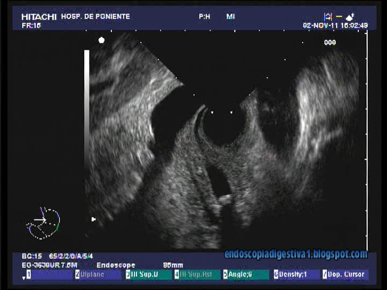 La ultrasonografía endoscópica (USE), por fin, se está difundiendo en muchos centros hospitalarios de nuestro país. Aunque es una técnica con una curva de aprendizaje relativamente larga, tiene como grandes ventajas que sus complicaciones son similares a las de una gastroscopia y la grandes posibilidades diagnósticas (sobre todo) y terapéuticas. Una de las indicaciones clásicas, donde la técmica tiene una gran rentabilidad diagnóstica (S y E cercanas al 100 %), es la coledocolitiasis, incluso aquellas < 5 mm como el caso que aquí se presenta. Cuando se compara con la CPRM (colangiopancreatografía por RMN) la S y E es algo mayor que ésta. Además suele ser bastante sencilla y rápida de realizar para descartar esta patología. Los dos instrumentos (radial y sectorial) son válidos, aunque es cierto que la USE radial es bastante mas sencilla de realizar dado que las imágenes son mas familiares en la interpretación anatómica.