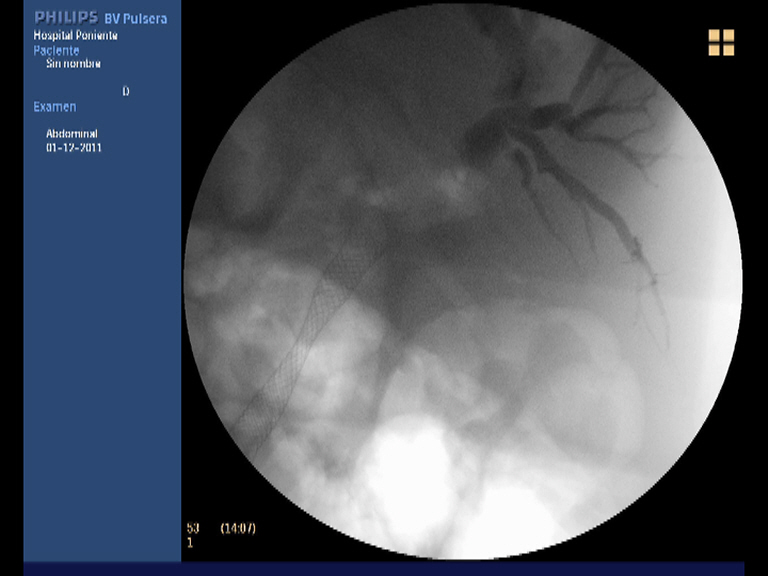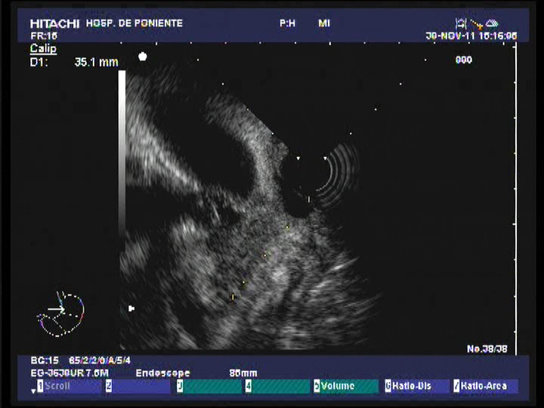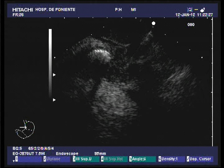 Paciente varón de 60 años de edad, sin antecedentes de interés que presenta dese hace un par de meses pérdida de peso importante (10 kgr), molestias epigástricas vagas junto a coluria e ictericia progresiva. Analíticamente destaca una BRT de 16 mgr/dl, a expensas de la fracción directa (8.21 mgr/dl), con ligera hipertransaminemia (GOT 68 UI/L, GPT 74 UI/L), GGT 1115 UI/L, FAT 558 UI/L e hiperlipemia mixta. El Ca 19.9 se encontraba a unos niveles de 242 UI/dl. Se practica una ecografía abdominal con el hallazgo de una masa en la cabeza pancreática de 3 x 2.7 cm, hipoecoica e irregular que obstruye el colédoco (dilatación retrógrada de unos 11 mm) junto a dilatación de la vía biliar intrahepática, vesícula dilatada (Courvoisier) sin adenopatias evidentes. El TAC trifásico realizado unos días después confirmando la existencia de la masa descrita a nivel de la cabeza pancreática (3 cm), que contacta con la pared duodenal, pero no infiltra la vena porta ni la VMS. Múltiples adenopatías de entre 5 y 1 cm adyacentes al tronco celíaco y peripancreáticas. Él colédoco y la vía biliar intrahepática se encuentran muy dilatadas, así como la vesícula biliar y el conducto pancreático. Con el diagnóstico de posible adenocarcinoma pancreático T3-N1-M0, se realiza una USE radial en nuestro centro, donde además de lo ya observado (la masa no obstante es de mayor tamaño 3.5 x 4 cm) en las anteriores pruebas diagnósticas, se confirma la infiltración de la VP y la confluencia con la VMS. El tronco celíaco y la AMS están libres de afectación tumoral. También se observaro varias adenopatías en el TC y peripancreáticas. Dado los niveles de BRT se decide colocar una prótesis biliar completamente recubierta por CPRE como drenaje biliar. Finalmente, para la confirmación histológica de la neoplasia, se realiza una USE-PAAF. El análisis citopatológico confirma la presencia de células malignas, aunque no se especifica la extirpe (quizás por la poca experiencia que aún se tiene en el estudio citológico).
