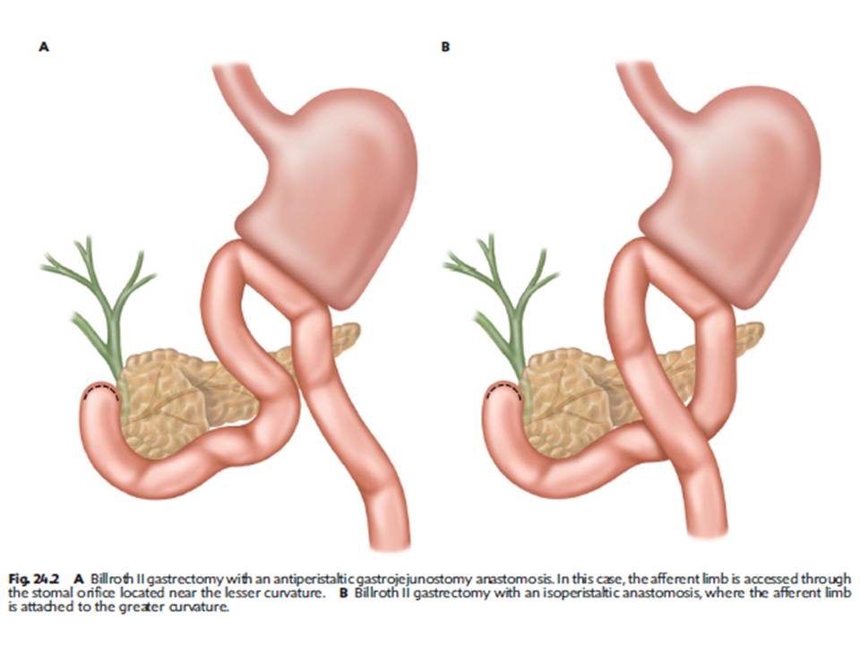La CPRE en pacientes con cirugía gástrica tipo Billroth II es un reto terapéutico para muchos endoscopistas. La tasa de fracasos oscila entre el 10 % (centros de referencia), y el 34 % global. Para realizarla se puede usar un duodenoscopio (visión lateral) o un gastroscopio (visión frontal). Existe controversia sobre que endoscopio es el mas apropiado aunque no se han encontrado diferencias. De hecho, hay una tendencia a usar los endoscopios de visión frontal ya que el acceso al asa aferente suele ser mas sencillo y quizás con menor riesgo de perforación por tracción de ésta al intentar introducirlo. En cualquier caso, uno de los puntos mas dificiles de una CPRE en la cirugía gástrica Billroth II es localizar el asa aferente y acceder a su fondo para enfrentar la papila. Dependiendo del tipo de cirugía realizada, nos vamos a encontrar el asa aferente hacia arriba-derecha (generalmente con mayor acumulación de burbujas biliares) si la intervención es con una anastomosis gastroyeyunal antipersitáltica y hacia abajo-izquierda si se trata de una anastomosis isoperistáltica (ver esquema a continuación). Existe una variante de esta cirugía (modificación de Braun, donde se realiza una anastomosis entre las asas aferente y eferente para evitar o reducir el reflujo biliar) que puede confundir aún mas al endoscopista.