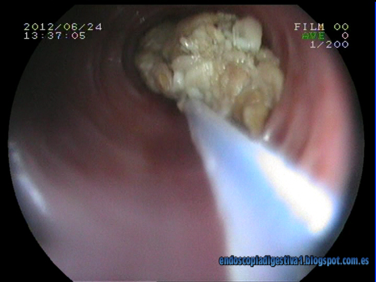 La impactación de bolos de carne en el esófago es la causa más común de cuerpos extraños (CE) en el esófago. Puede existir una estenosis benigna o maligna subyacente que la precipite (la estenosis péptica una de las mas comunes). En otras ocasiones hay un trastorno motor esofágico subyacente. Recientemente se ha asociado a la exitencia e la esofagitis eosinofílica (la existencia de episodios recidivantes de impactación de alimentos en el esófago en un paciente joven obliga a decartar esta entidad). Suele usarse la buscapina, benzodiacepinas o el glucagon iv para favorecer la relajación del músculo liso esofágico con resultados variables. Entre los dispositivos usados para la extracción endoscópica, sin duda el de mayor utilidad es el asa de polipectomía, que puede, como en este caso, permitit la extracción en bloque. Otras veces, cuando han pasado varias horas tras la ingesta, la maceración producida por la saliva impide que se exgtraiga en un solo paso y se require introducir varias veces el endoscopio. Otro dispositivo muy usado en estos casos es la pinza de tres patas (trípode) Si se descarta una neoplasia o estenosis subyacente con cierta seguridad, pudee empujarse el bolo con el endoscopio de forma cuidadosa para favorecer el paso al estómago.