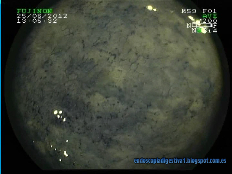 Paciente varón de 30 años de edad, sin antecedentes de interés que acude a la consulta de cirugía por rectorragia recidivante en cuantía moderada con patrón distal y astenia, de mas de un año de evolución. Se realizó una primera colonoscopia hace un año con diagnóstico de hemorroides internas grado II/IV y sigmoiditis inespecífica. Las biopsias no fueron concluyentes. No recibió ningún tratamiento específico para la lesión descrita. En la colonoscopia actual destaca la existencia de un área de unos 5-6 cms de extensión, de aspecto vascular-angiomatoso, desde la unión rectosigmoidea proximalmente, siendo la mucosa del recto de aspecto normal. También se encontraron unas hemorroides internas grado II/IV. Analíticamente destaca una anemia ferropénica importante, dada la edad del paciente (Hb 8.8 ngr/dl, VCM 71, Ferritina 10 mgr/dl).