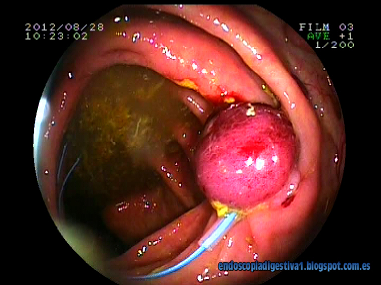 Nuestra única y excelente residente se atreve con técnicas de endoscopia avanzada como el tratamiento de tumores submucosos benignos localizados en el colon. En este caso se trataba de un paciente portador de una cáncer de recto y varios pólipos de colon al que se le encontró en la primera endoscopia realizada, un lipoma de unos 2 cm en el colon ascendente. Cuando se le realizó la segunda colonoscopia se observó que dicho lipoma estaba ulcerado y podría tener un papel en la anemia que padecía el enfermo. Por este motivo se decidió colocar un lazo en la base bien ajustado con idea de que se produjera su desprendimiento en unas 2 semanas y así evitar el riesgo de sangrado (HDB). Esta técnica es la denominada «Let and Go», y ya fue expuesta en una entrada anterior de este blog (https://www.digestivendoscopy.com/2011/09/12/lazo-hemostatico-endoloop-una-tecnica/). Enhorabuena Dra. Romo por tus avances en la endoscopia terapéutica.