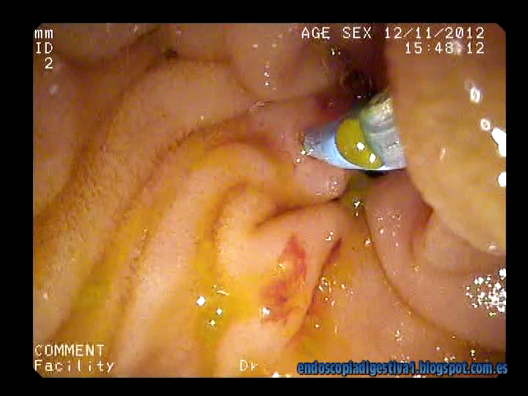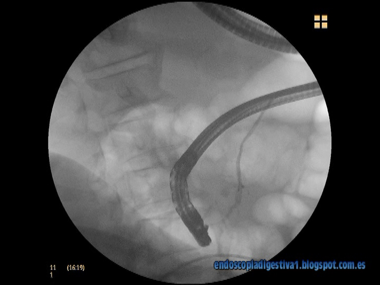 Paciente varón de 81 años de edad, con antecedentes de cardiopatía isquémica (IAM en 2004) con cateterismo y colocación de 2 stents coronarios HTA e ICC asociada. Ingresa por un cuadro clínico y analítico compatible con pancreatitis aguda biliar, aunque en la geografía no se apreció litiasis biliar (BRT 3 mgr/dl con predominio de la fracción directa, GPT 136 UI/L, amilasa de 1421 UI/L). La evolución en las siguientes 48 horas fue tórpida y aplicando el protocolo de valoración de la gravedad de la PA del Club Español Pancreático que considera PA grave si aparecen mas de 2 valoraciones positivas (primeras 24 horas: impresión clínica de gravedad APACHE-II > 8; a las 48 h: Ranson > 3, PCR > 150 mgr/dl; al 4º día: TAC dinámico con contraste y aparición de fracaso orgánico (FO) en cualquier momento). La pancreatitis se consideró por tanto de gravedad. Como datos destacables de lo referido, en las primeras 24 horas, el paciente presentaba sensación de enfermedad grave, con dolor abdominal intenso, importante distensión abdominal, signos de deshidratación, TA 90/60 mm Hg y una valoración APACHE-II > 12. A las 48 horas del ingreso la puntuación Ranson era de 4 puntos, destacando un Hto del 45 %, urea 104, creatinina 1.3, calcio 7.9, plaquetas 81000 con AP del 63 % y PCR de 27 mgr/dl. En la placa de tórax destacaba un derrame pleural bilateral importante asociado a cardiomegalia. En el TAC realizado se aplicó un valor C de Balthazar sin necrosis. En este momento se consultó con la UCI que desestimó el ingreso en dicha ubicación por el pobre pronóstico y la edad del paciente. En este momento, a la desesperada, se decide realizar CPRE urgente para intentar una esfinterotomía biliar. En la intervención destaca un importante edema de los pliegues duodenales a nivel del área papilar. La papila es de difícil localización y posicionamiento al encontrarse en el margen izquierdo de un divertículo. La conjunción del edema de pliegues, el divertículo yuxtapapilar y el peristaltismo, tras 45 minutos de intervención, hacen imposible la canulación biliar. Ante este evento, se decide usar un canulotomo para poder entrar en Wirsung, que finalmente se consigue. Se realiza pancreatografía confirmatoria y se decide colocar un stent pancreático de 5 Fr/5 cm con flaps duodenal e interno con muy buen drenaje del contraste.