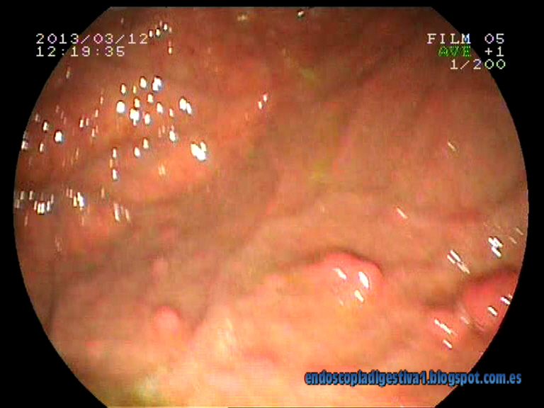 Cuarta y última entrada del paciente portador del Síndrome de Peutz-Jeghers (SPJ). En este caso se trata de una duodenoscopia que se realizó para valorar la papila y la existencia de pólipos gástricos. Como era de esperar se apreciaron múltiples pólipos de pequeño tamaño (< 1 cm) en el cuerpo y fundus gástrico preferentemente, así como una papila de morfología «extraña». Recordaba a un pólipo «hamartomatoso». las biopsias no fueron concluyentes y se especificada una histología compatible con pólipo hiperplásico.