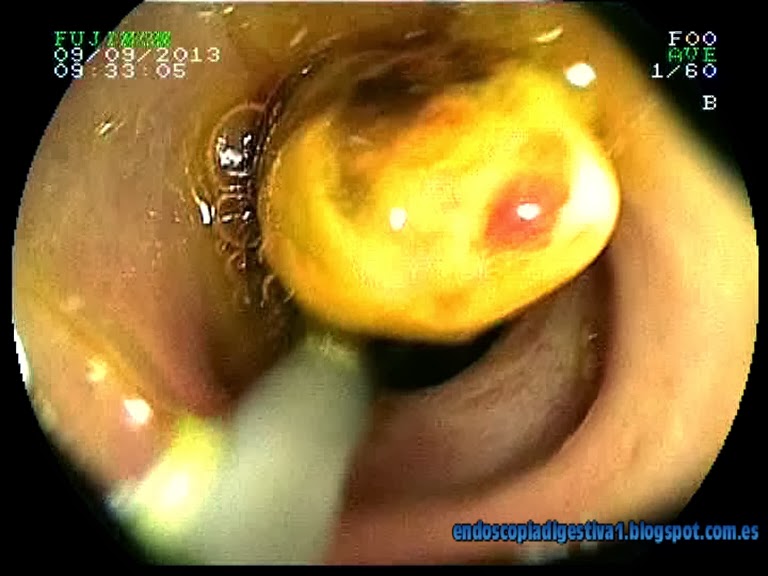 Paciente varón de 63 años de edad, con antecedentes de miocardiopatía dilatada severa y HTA. Colecistectomizado. A mediados de 2010 ingresa en nuestro centro por un cuadro de colangitis por hepatolitiasis izquierda. En la CPRM (colangiorresonancia magnética) se apreciaba una dilatación importante de la vía biliar intrahepática a expensas de la rama izquierda, con varios defectos de repleción en su interior compatible con litasis intrahepática múltiple. Se realizó CPRE con «aparente limpieza de la vía biliar». No obstante, el paciente reingresó a las pocas semanas por un nuevo cuadro séptico junto a la formación de varios abscesos en el LHI. Se consultó el caso con cirugía y se decidió tratamiento quirúrgico. Aunque en principio se planteó un tratamiento agresivo con extirpación del LHI, los cirujanos realizaron una hepatoyeyunostomía alta en Y de Roux. El paciente estuvo asintomático hasta el mes de agosto del presente año, cuando ingresa por un nuevo cuadro séptico de origen biliar grave que determina su ingreso en UCI. Responde a tratamiento antibiótico iv intenso y se decide realizar uan CPRE con enteroscopia de doble balón que resulta exitosa: se consigue acceder al asa aferente y a la anastomosis hepatobiliar y extraer todas las litiasis. El paciente fue dado de alta  y hasta el momento no ha tenido complicaciones.