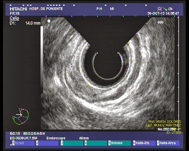 Paciente mujer de 78 años de edad con AP de hipotiroidismo, cardiopatía isquémica leve y diverticulosis coli. Valorada en consulta externa por un cuadro inespecífico dispéptico sin síntomas de alarma de 2 meses de evolución. Se realiza gastroscopia observando una lesión subcardial en el interior de un pequeño saco herniario, de unos 10 mm de extensión, plana con ligera elevación. La histología de las biopsias demostraron un adenocarcinoma gástrico bien diferenciado de tipo intestinal. El estudio analítico con marcadores tumorales de adenocarcinoma y TAC toraco-abdominal fueron normales. Se realizó ecoendoscopia radial donde se describe una lesión subcardial de unos 14 mm dependiente de la primera y segunda capa con dudosa infiltración submucosa (3ª capa), sin adenopatías asociadas. Con el diagnóstico de adenocarcinoma gástrico precoz probablemente T1b, se decide realizar mucosectomía endoscópica con el doble objetivo de valorar la profundidad de penetración parietal y secundariamente la posibilidad de curación endoscópica. La técnica se realiza de forma protocolizada en varios pasos. En primer lugar se tipifica con cromoendoscopia digital FICE-4 el tamaño y morfología de la lesión (14 mm, tipo mixto 0-IIa + IIc de la clasificación de París -lesión plana con ligera elevación y algún área deprimida-). Como segundo paso se comprueba la elevación de la lesión con una mezcla de SSF, adrenalina 1/20000 e índigo carmín (lifting sign) que descarta la infiltración profunda de la submucosa. En tercer lugar se delimita la lesión con márgenes de seguridad (> 3 mm). Como 4º paso se reseca la lesión con bandas (sistema Duette) en 3 fragmentos (el 80 % de la lesión queda incluida en la primera banda) sin complicaciones inmediatas. Por último se recuperan los fragmentos con cesta de Roth para estudio histológico. El estudio anatomopatológico es compatible con un adenocarcinoma gástico precoz de tipo intestinal, bien diferenciado con penetración a la muscularis mucosae, pero sin infiltración de la submucosa ni infiltración vascular y linfática a dicho nivel (estadio T1a). Se considera curativa endoscópicamente.