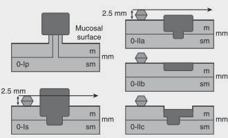 Por lo tanto, actualmente las indicaciones para EMR en el estómago serían: lesiones < 1.5 cm (extirpación a ser posible en un solo bloque), morfología tipo II (clasificación de París), con histología bien diferenciada, con infiltración submucosa < 500 micras y márgenes libre de tumor (< T1b Sm1).