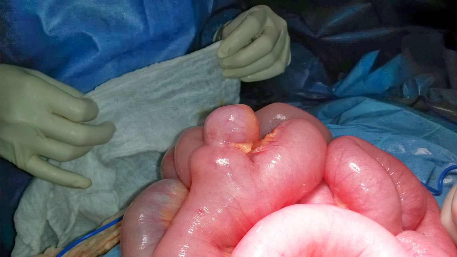 Paciente de 24 años sin antecedentes personales de interés con hemorragia de origen oscuro/indeterminado (presentación en forma de melenas y anemia) de 1 año de evolución a quien se le había realizado un estudio con gastroscopia, colonoscopia, transito intestinal, cápsula de intestino delgado y una enteroscopia anterógrada sin hallar patología. Ingresa recientemente en nuestro centro por hemorragia masiva y signos de shock hipovolémico. Se realiza enteroscopia anterógrada en quirófano y colonoscopia evidenciando salida de sangre roja a través de la válvula ileocecal. Se decide laparotomia exploratoria, que revela la presencia de un diverticulo de unos 3-4 cm en el borde antimesentérico del íleon, a unos 90 cm de la válvula ileocecal. Se realiza enteroscopia a través de enterotomía proximal al divertículo logrando la entrada en su interior, que aunque no estaba sangrando en ese momento, si presentaba una zona en el vértice/borde antimesentérico deprimida con bordes edematosos que podría corresponder al punto sangrante. Se completó la enteroscopia en sentido anterógrado y retrogrado a través de la enterotomía sin otros hallazgos. Se realizo la resección del diverticulo. El paciente evoluciono satisfactoriamente y no ha vuelto a sangrar.