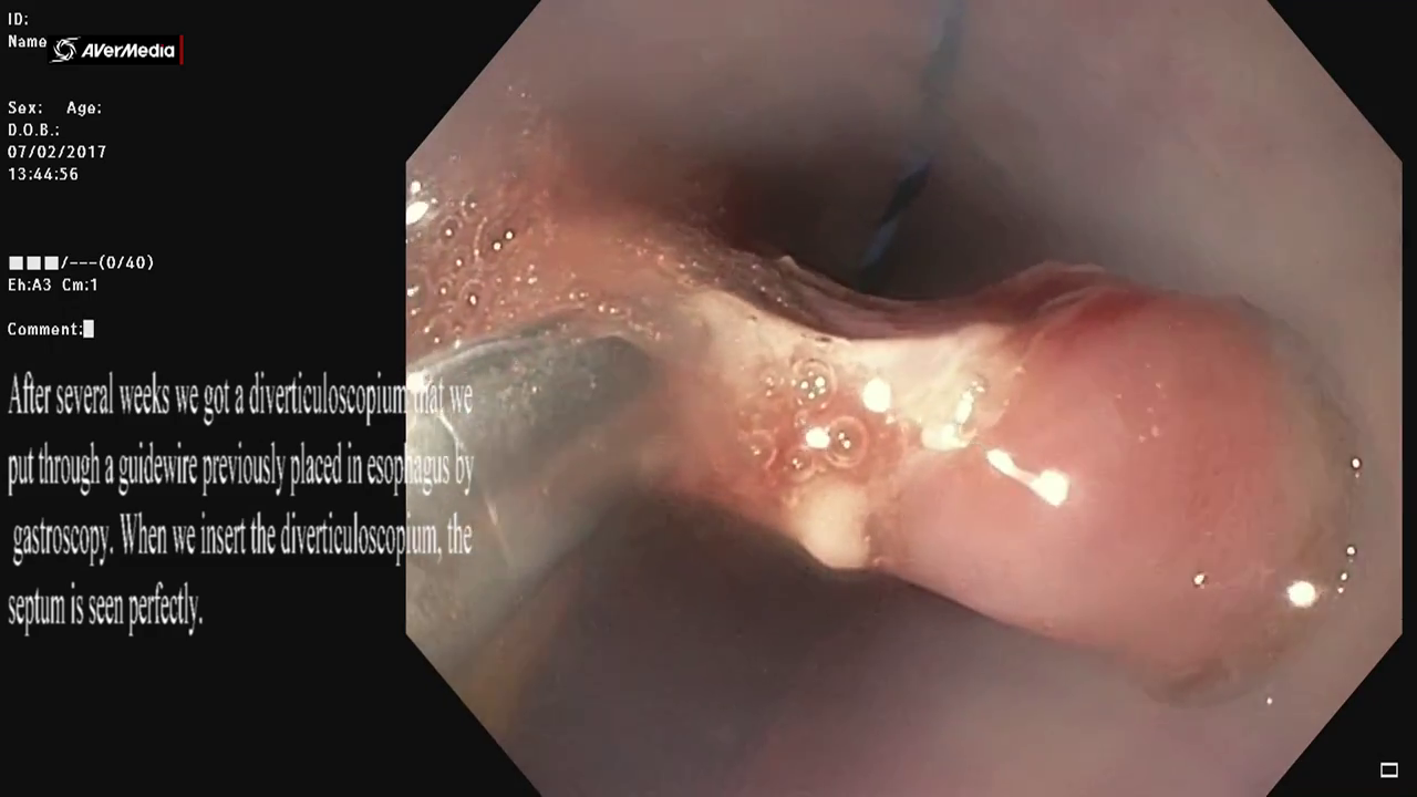 After several weeks we got a diverticuloscopium that we put through a guidewire previously placed in esophagus by gastroscopy. When we insert the diverticuloscopium the septum is seen perfectly.