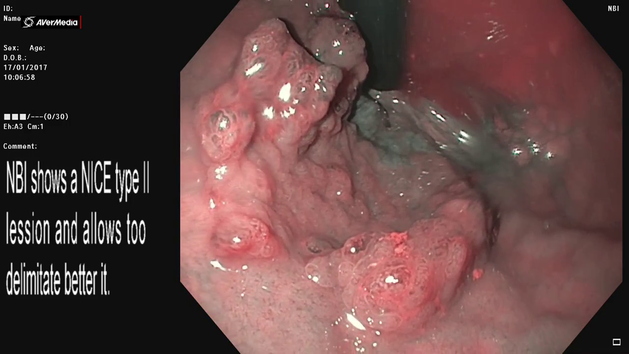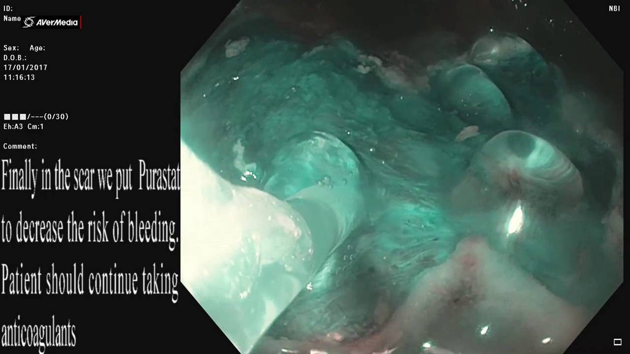 82 year-old female patient with history of arterial hypertension, Diabetes Mellitus, Hypothyroidism, ACV, AF in treatment with pradaxa. She consulted for rectal bleeding and a colonoscopy showed a 3 cm 0-IIa + 0 – Is lession at rectoanal junction. NBI shows a NICE type II lession and allows too delimitate better it. We have used hyaluronic acid 0.8% and methylene blue starting at the anal margin and then in retroflxexion at the distal margin.We have worked with a 185 Olympus gastroscope in retroversion. For the mucosectomy we used a 25 mm Olympus loop and a 15 mm Boston Scientific loop. Finally in the scar we put Purastat to decrease the risk of bleeding. Patient should continue taking anticoagulants.